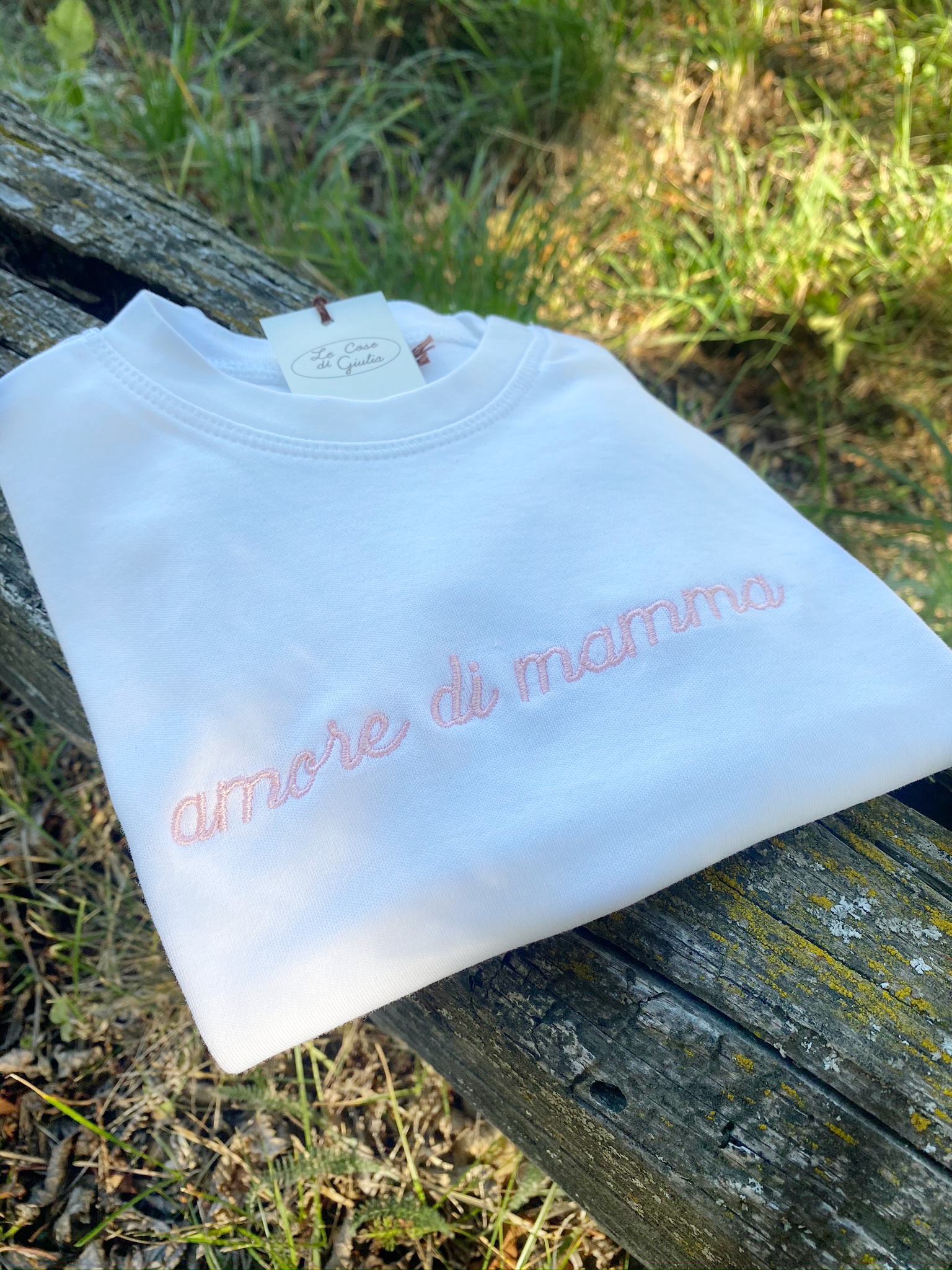 T-shirt mezza manica in morbido cotone organico, personalizzata con la dolcissima frase “amore di mamma” .