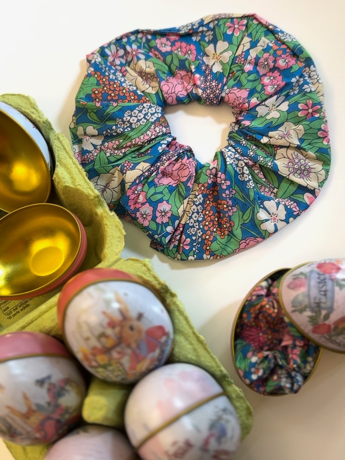 Quest’anno la sorpresa non sarà di cioccolato, ma sboccerà tra i capelli: uno scrunchie in Liberty Fabrics racchiuso in un guscio di latta decorata.